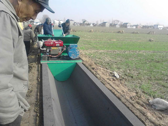 ![]() ![]() ![]() ![]() 建筑材料的要求 A、水泥。标号明确,质量经过签定(批量应有质保书),符合要求者方可使用。常用水泥标号有325#、425#或525#普通硅酸盐水泥或矿渣水泥。水泥不准露天堆放,水泥贮存时间超过三个月的,应视实际情况降低标号使用(贮存三个月强度降低20%)。 B、黄沙。按照就地取材的原则,要求质地坚硬、清洁,级配良好,含沙量不超过3%,否则应淘洗干净,方便使用。混凝土配料宜选用中、粗砂,砂浆可以采用细沙。 C、石子。选用质地坚硬、有棱角、表面粗糙的块状碎石,石子粒径应符合级配标准,清洁干净,石子最大粒径不得超过断面厚度最小尺寸的四分之一。 D、水。凡适合饮用的自来水和天然水均可使用。未经处理的工业污、沼泽水和含盐量高的水不得用于拌制和养护混凝土。 施工要求 A、应根据测量放线,进行渠道基槽的挖、填和修整,清除工程范围内的树根、淤泥、腐殖土和污物,严格控制渠道基槽断面的高程、尺寸和平整度,其偏差值应满足下表的要求。 一次成型现浇防渗渠施工断面允许偏差值 项目 允许偏差值(厘米) 渠底高程 ±2-3 渠道中心线 ±2-3 渠底宽度 ±3-5 渠槽上口宽度 ±4-8 渠底及内边坡平整度 ±2-3 注:大、中型渠道应符合大值要求,小型渠道应符合小值要求。 B、一次成型现浇防渗渠按照规划及结构尺寸进行放线,采用机械或人工培模,利用大样板修整模的尺寸,要求培模夯打密实,回填土应分层夯实,层厚不大于20厘米,干容重不低于1.55吨/立方米。土模成型一应尽快浇筑,不能及时若浇筑,必须用塑料薄膜覆盖,防止风吹、日晒、雨淋损坏模型。 C、施工过程中,对原材料要分期分批取样检验。使用材料的配合比,应随时抽检复查,施工的各道程序应严格检查验收,施工中的各种材料的称量偏差值为水泥±2%,黄沙±3%,碎石±3%。 D、现浇渠道施工宜在温暖季节施工。日平均气温5℃以下或最低气温在-3℃以下混凝土施工应按《水工混凝土施工规范》SDJ207-82低温季节施工的要求进行。日平均气温低于-5℃时,应停止施工。 E、拌制混凝土应严格按照设计配合比配料,不得擅自更改。应坚持筐筐过磅称量,不得采用只称一筐顺自目估的不严格配料方法。混凝土采用机械拌和时,净拌时间不得低于2分钟,当采用人工拌合时要求做到干拌三遍湿拌三遍,待颜色一致方可使用。 F、浇筑混凝土应连续进行。混凝土应随拌随用如发生离析、严重泌水、漏浆、塌落度降低等问题时,应在浇筑现场重新拌合,若超过混凝土初凝时间,应按废料处理。混凝圭凝结时间不得超过下表规定 混凝土标号 混凝土的凝结时间(分钟) 气温低于25℃ 气温高于25℃ 300号及300号以下 210 180 300号以上 180 150 G、浇筑混凝土间歇时间超过混凝土初凝时间应按施工缝处理。施工缝的混凝土表面凿毛,在继续浇筑之前用水冲洗干净,湿润后在表面铺上10-15毫米的水泥砂浆一层,其标号及水泥品种与被处理的混凝土相同。 H、在雨季施中,下雨时不宜露天浇筑混凝土,浇筑后应及时覆盖,防止雨水对新浇混凝土的冲涮。混凝土浇筑完毕后12小时以内,即应加以覆盖和洒水养护,干硬生混凝土应于浇筑完毕后立即覆盖并洒水保持表面湿润。养护日期如是水泥时不得少于7昼夜,如用矿渣水泥、火山灰水泥不得少于14昼夜,对于抗渗要求的混凝土不得少于14昼夜。 I、现浇防渗渠施工时混凝土标号应大于150号,石子粒径不大于2厘米,水灰比控制在0.6-0.65之内。对施工中局部出现的蜂窝、麻面、等缺陷应及时用水泥砂浆由人工压板进行修补、复原。并对混凝土进行一到二次收面压光。要求收面后的混凝土渠道表面平整光滑,无外露石子和裂缝等不良缺陷。 伸缩缝处理 一般现场浇筑的素混凝土时,纵横向均为3-5米,主要原料为沥青砂浆、焦油塑料胶泥和塑料止水带等。在伸缩缝采用梯形或矩形缝时,缝口宽度为1.5-2.5厘米。填料宜采用粘结力强,变形性能大且耐老化的材料如焦油、塑料胶泥或部分填入焦油塑料胶泥,上部用沥青砂浆或水泥砂浆灌制。 工作原理: 产品工作时,首先起动电动振动器为落料做准备,当混凝土通过本机喂料斗进入推进器后,起动液压泵站、油缸开始伸缩运动,由推进器将混凝土推进到渠道成型模所形成的U 型空腔内,这时成型模起内模胎作用,成型混凝土吸附在经机械铲刀修理过的渠槽壁上,渠槽压顶也同时挤压成形。同时利用电动振动器的振动和液压油缸的推料,产生挤压、密实受力而使得机械主体前边两侧导向滚轮在渠槽两侧安放轨道内进行直线运动,从而实现自动行走的功能。由于油缸的推力和振动器对混凝土的振动,增强了U型渠的密实度和强度,实现U型构件长距离、薄壁厚、强度高、防渗漏、外观美五大性能的优点。 该设备与预制瓦片安装防渗渠和土模现场浇筑机械相比,节水55%以上,工作进度提高5~8倍。攻克了预制板防渗渠后期不易于管理,受环境影响较大,易损坏的行业难题。目前,该公司已相继向国家知识产权局申请了全自动节水防渗渠现浇成型机的发明、实用新型、外观设计共12项专利。 该机采用全自动液压控制,性能稳定可靠,经久耐用,自动化程度高,劳动强度低,具有精修渠道槽基,自动行走,自动控制渠道的浇筑厚度、水平度、直线度的高效功能,衬砌质量好,渠道端直,过水端面标准,混凝土密实,衬砌厚度均匀,表面光滑平整,整体性强,坚固耐用,防渗